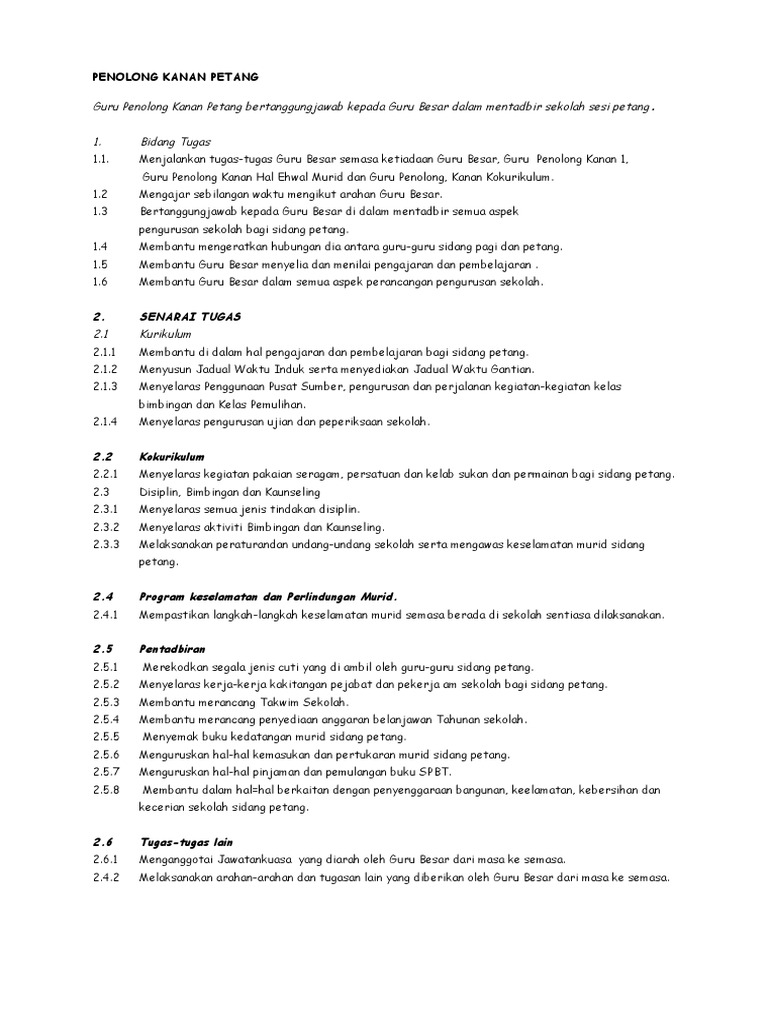 Guru Penyelia Petang bertanggungjawab kepada Guru Besar dalam mentadbir sekolah sesi petang. LAMPIRAN A FAIL MEJA PENOLONG KANAN KURIKULUM 1. Dec 29 2016 Senarai Tugas Guru Penolong Kanan Kokurikulum dan Jawatankuasa.