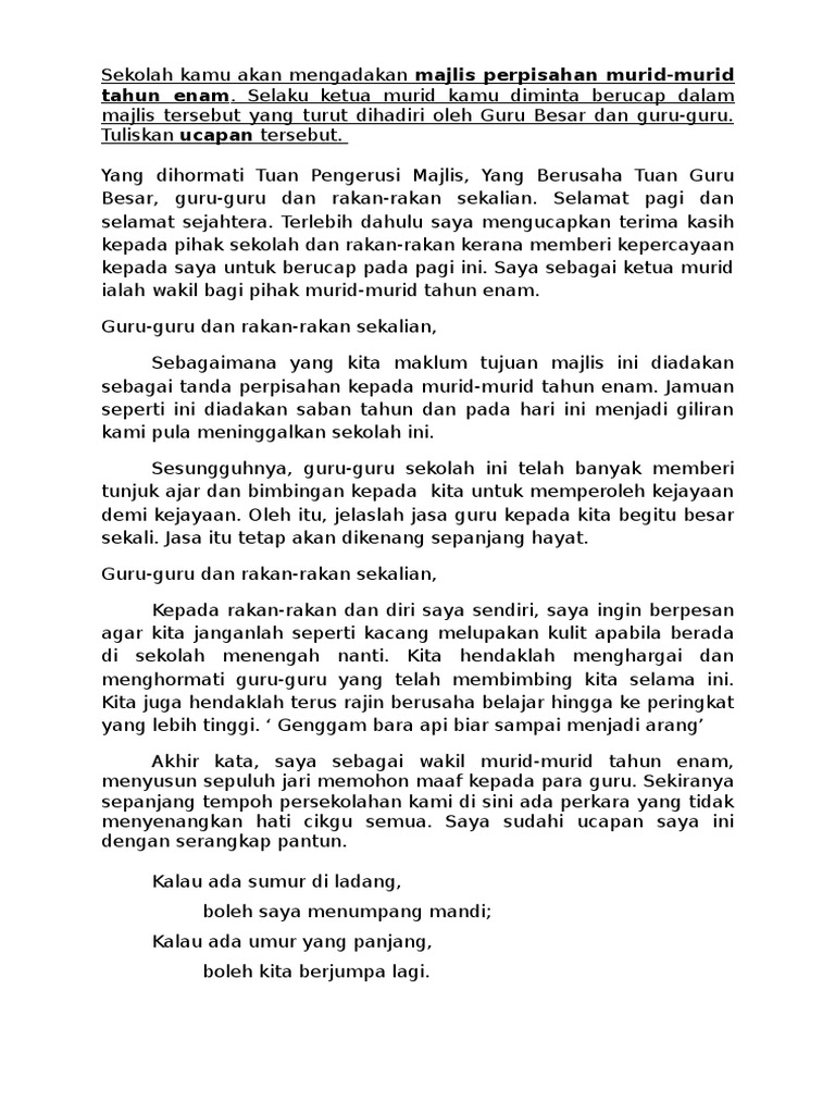 Aug 05 2018 Selamat petang diucapkan kepada guru besar Cikgu Eric Lim para guru dan rakan-rakan sekalian. Juru acara 1 dan 2 Dengan itu kami menyerahkan majlis kepada Penyelaras Program. Sebagai Ketua Murid kamu diminta berucap pada hari perpisahan murid-murid tahun enam.