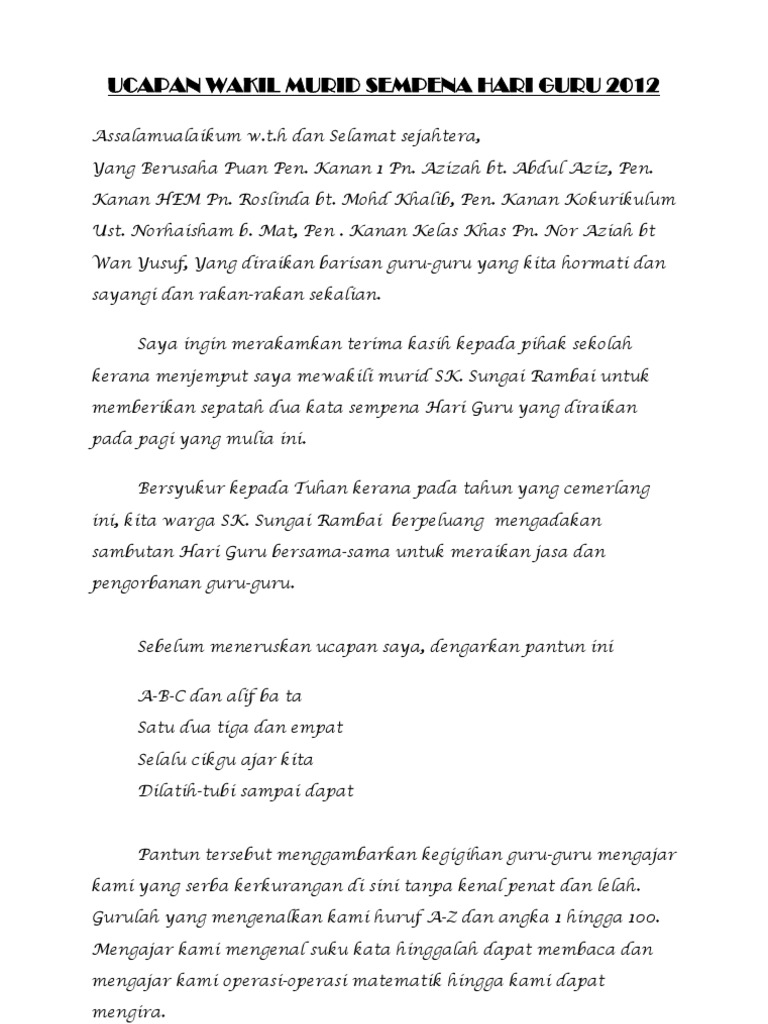 Salam sejahtera saya ucapkan kepada Tuan Guru BesarGuru Penolong Kananguru-guru dan rakan sekalianSaya sebagai wakil muridingin mengucapkan selamat menyambut Hari Guru kepada semua guru di sekolah ini. Oleh itu pemergian saya juga kenalah cara baik sejajar dengan cara layanan semua. Selamat pagi saya ucapkan kepada Tuan Guru Besar guru-guru dan rakan sekalian.