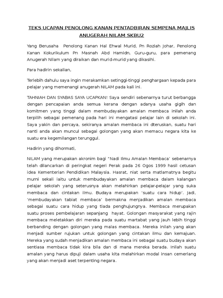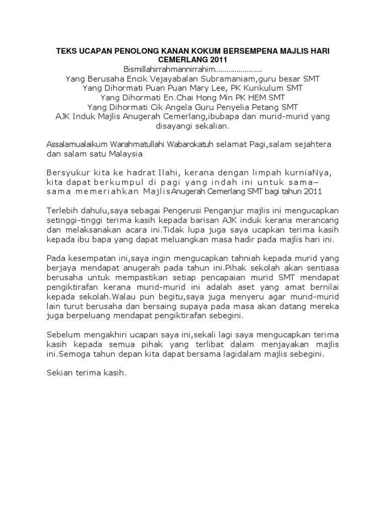 TEKS UCAPAN PENOLONG KANAN 1 mewakili guru-guru SMK Seri Hartamas Terima kasih TuanPuan Pengerusi Majlis Assalamualaikum warahmatullahi wabarakatuh dan selamat sejahtera. Yang Diraikan Yang Berbahagia Datin Zarina Binti Abdul Rahman Pengetua SMK Seri Hartamas Kuala Lumpur Yang Berusaha Puan Chempaka Emalin Bin Datuk Pahamin. The collection that consisting of chosen picture and the best amongst others.