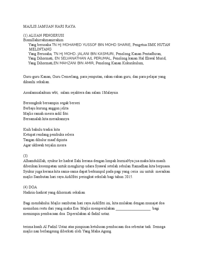 4 doa hadirin hadirat yang dihormati sekalian majlis sambutan hari raya aidilfitri ini kita mulakan dengan munajat doa memohon restu dari yang maha esa. Doc Teks Ucapan Pengacara Majlis Sambutan Hari Guru Dan Pekerja Sk Bangsar 25 Mei 2012 Raj Vincent Academia Edu.