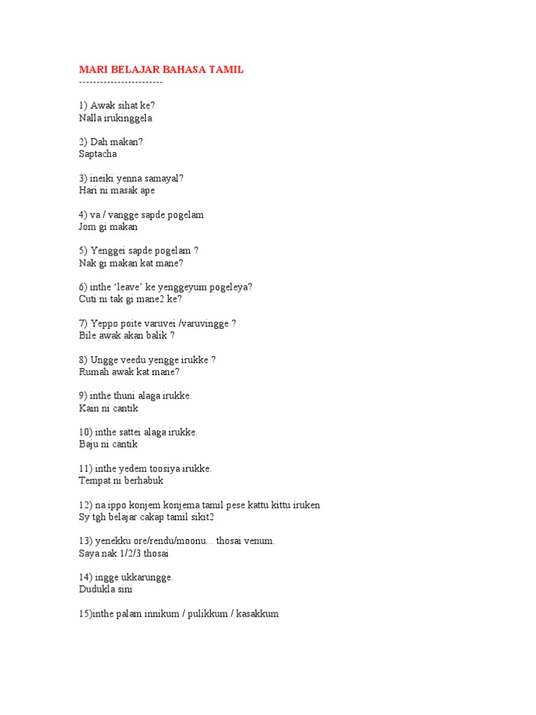Selamat tinggal buat masa ini. Bahasa Tamil Malaysia Tamil. Malēciya tamiḻ moḻi yang juga dikenal sebagai Malaya Tamil adalah sebuah varian lokal dari bahasa Tamil yang dipakai di Malaysia.