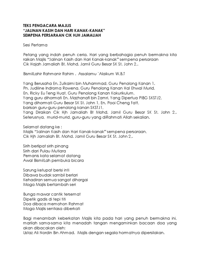 Oct 30 2018 TEKS PENGACARA MAJLIS PERSARAAN PN HAJAH FARIDAH ABDUL RAHMAN. Hadirin warga dewan sekalian. Teks ucapan pengacara majlis minum petang teks ucapan pengacara majlis persaraan teks ucapan pengacara majlis makan malam teks ucapan pengacara majlis sukan teks ucapan pengacara majlis rasmi teks ucapan pengacara majlis penyampaian hadiah teks ucapan pengacara majlis mesyuarat agung teks ucapan pengacara majlis kursus teks ucapan pengacara majlis perkahwinan teks.